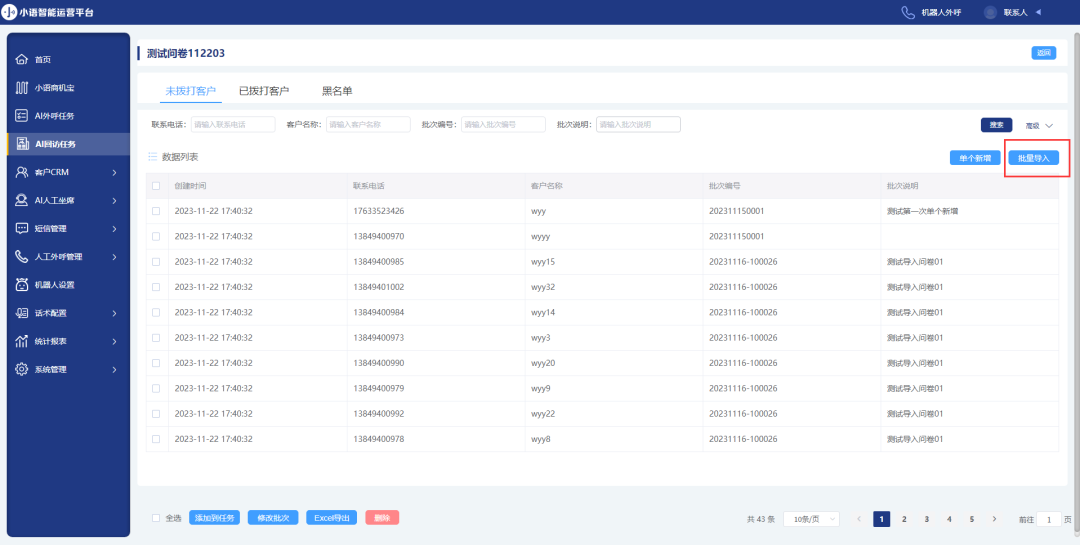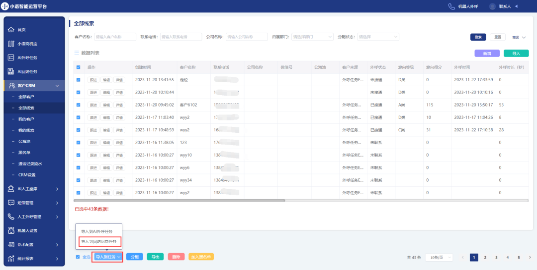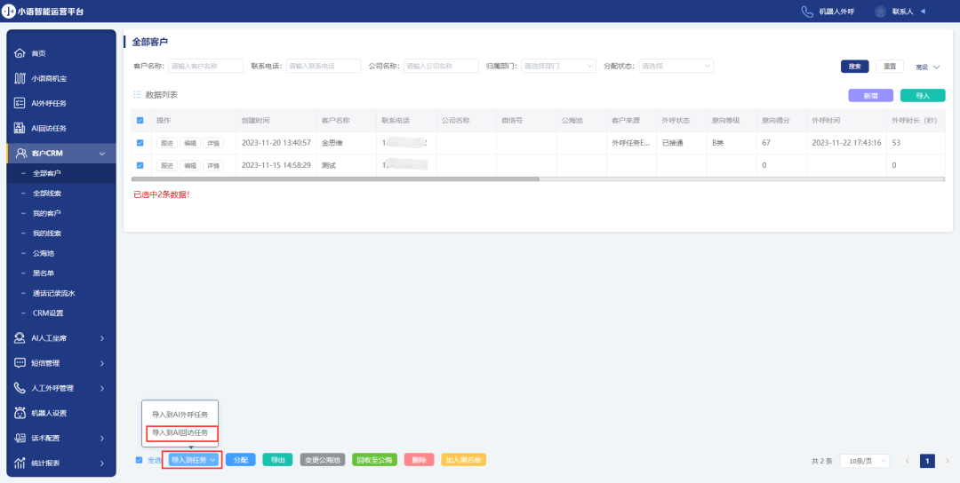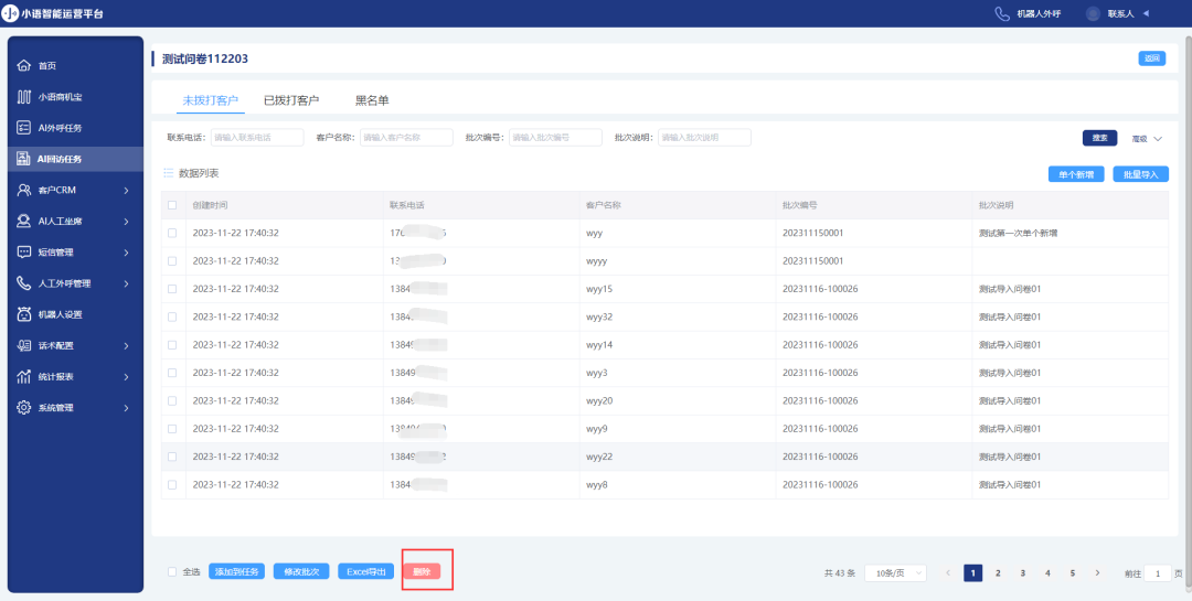13、AI回访任务,未拨打客户和已拨打客户,删除客户数据功能。