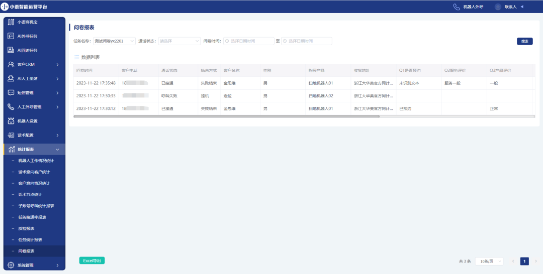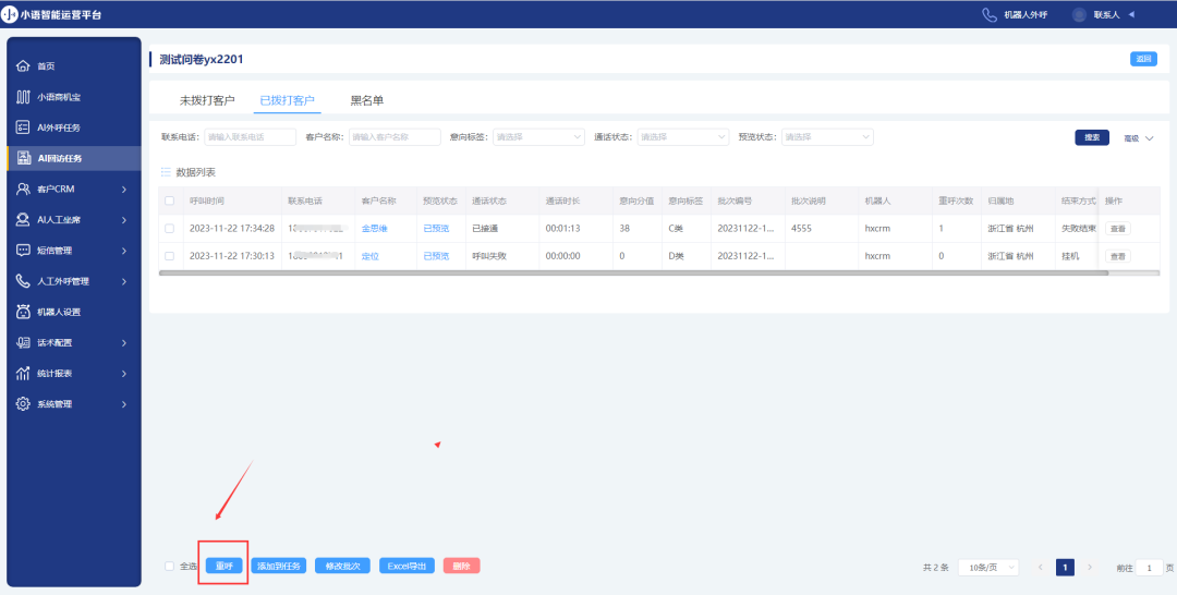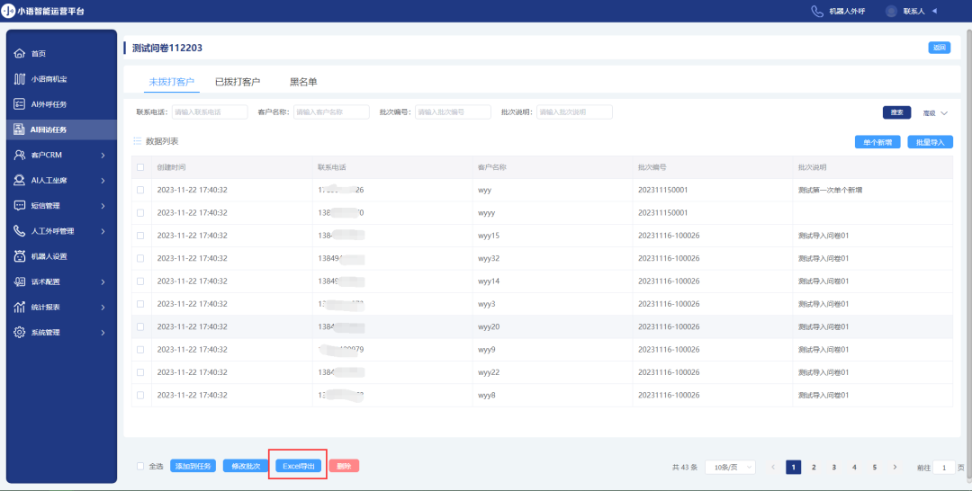 12、AI回访任务,未拨打客户和已拨打客户,Excel导出功能。