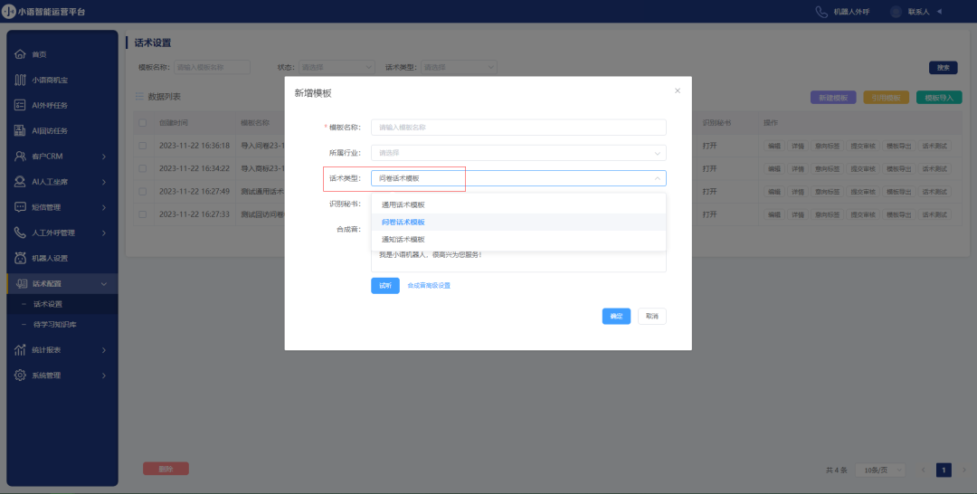 “AI回访问卷”新功能上线,增加问卷话术模板及AI回访任务多项功能。