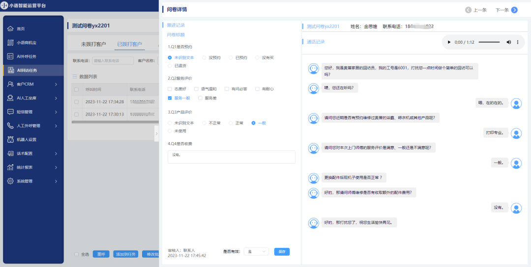 8、AI回访任务,任务数据—>已拨打客户,点击“查看”按钮,可查看问卷详情。