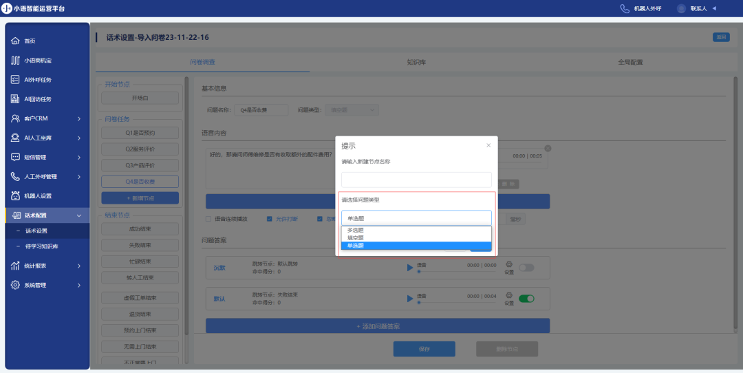 2、问卷话术中的问题类型支持单选、多选和填空。