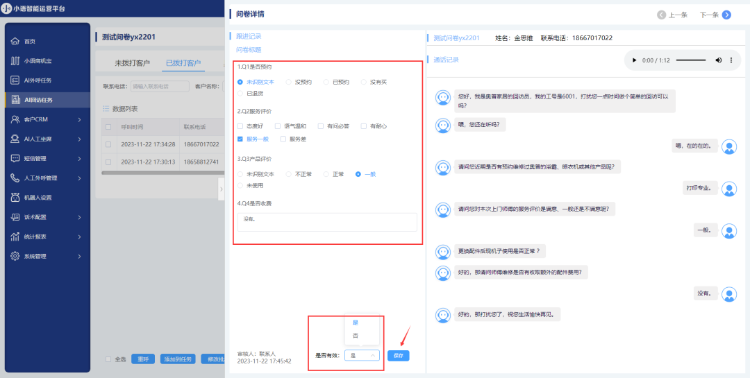 9、AI回访任务,问卷详情页面,可编辑问卷内容和填写是否有效。