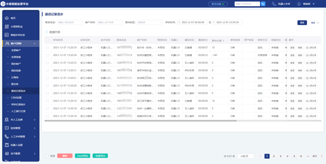 10、客户CRM—通话记录流水,可以查看机器人外呼的通话记录详情、听录音、导出、加入黑名单、删除。
