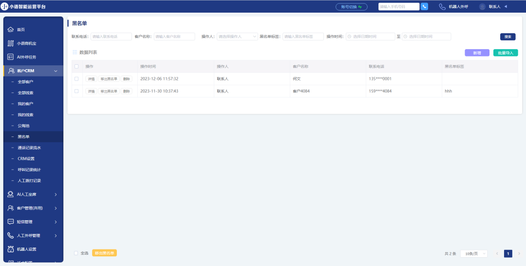 9、客户CRM—黑名单页面,可以进行新增、导入、移出黑名单、删除操作。