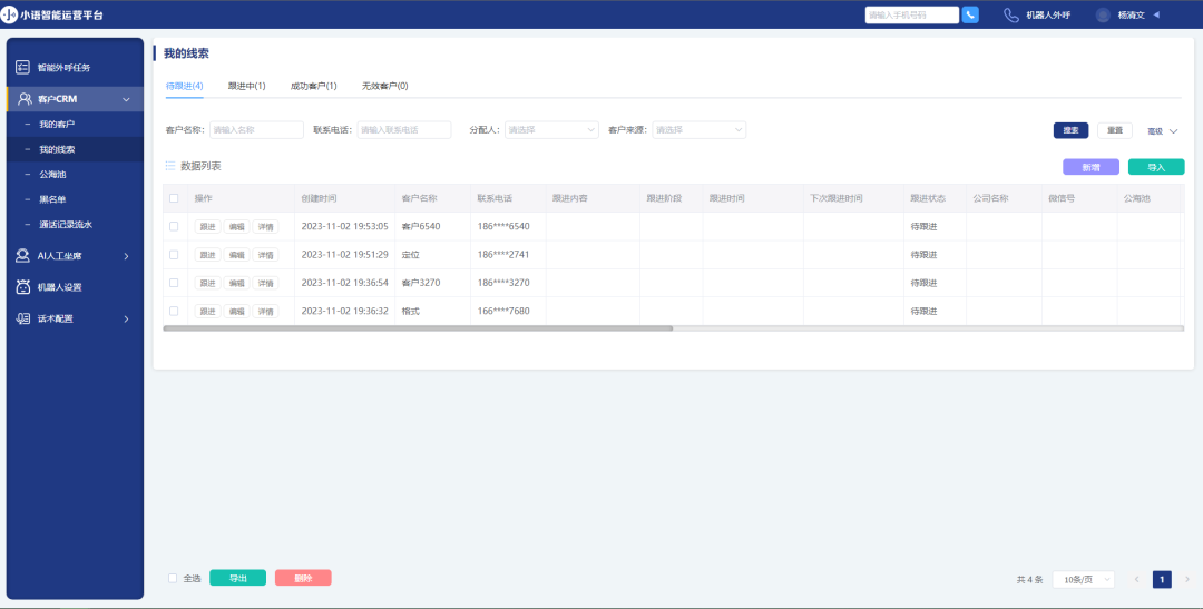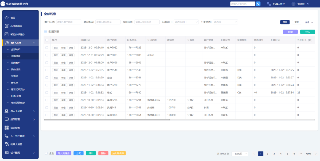 5、客户CRM—全部线索页面,可进行跟进、导入、分配、导出、删除、加入黑名单操作。