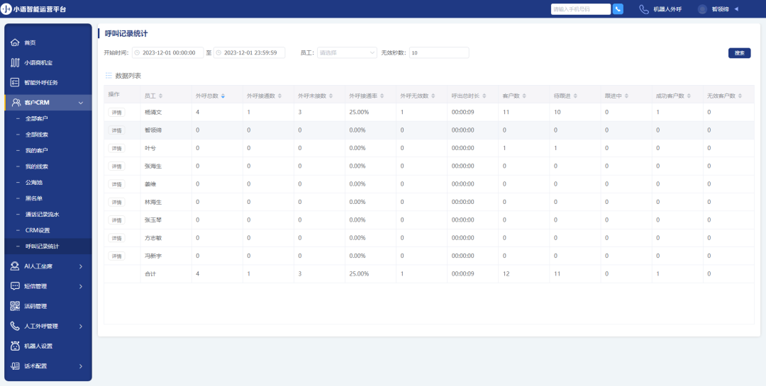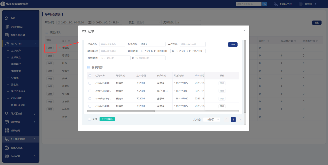 3、呼叫记录统计,点击详情,可查看该员工当天的呼叫明细。