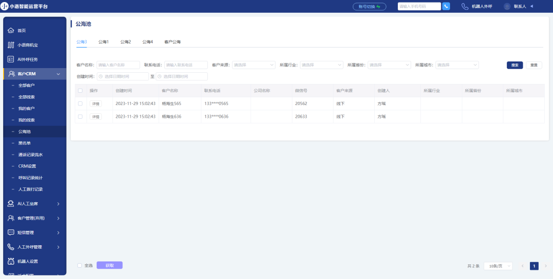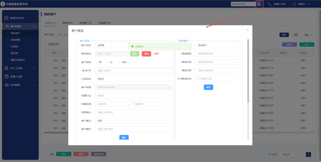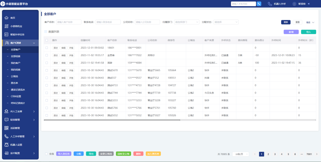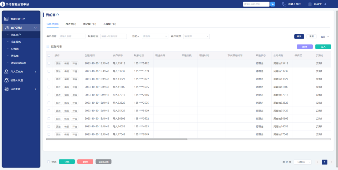 “CRM客户管理”功能,增加手动外呼功能、客户管理页面:可进行跟进、导入客户、导入到任务,分配、导出、变更公海池、回收至公海、删除、加入黑名单操作。