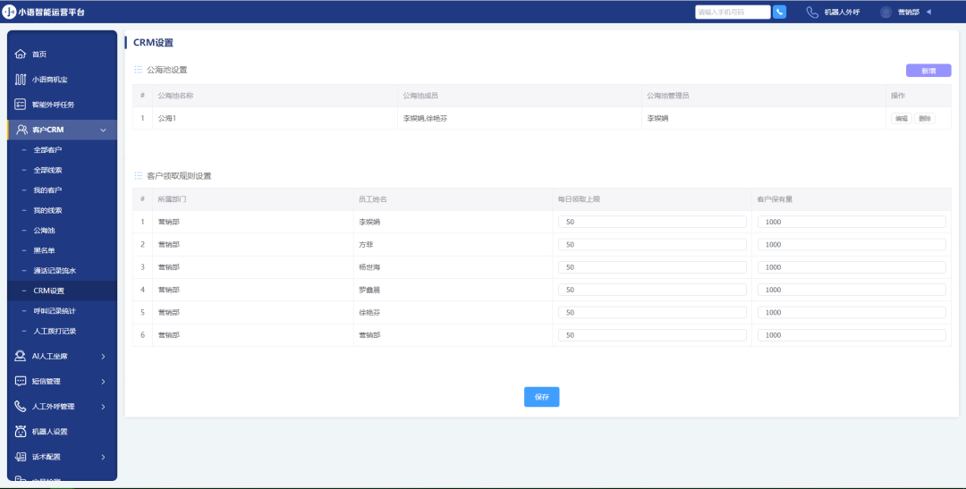 11、客户CRM—CRM设置,可以新建公海池、编辑公海池、删除公海池、设置每日领取上限、设置客户保有量。